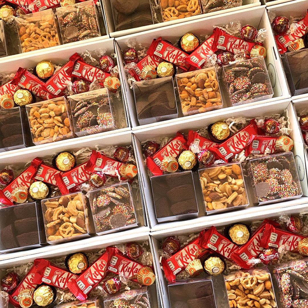 A collection of 3 sweet and savoury snack boxes, paired with assorted chocolates. The perfect pick-me-up for any time of the day.